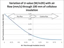 Insulations such as polyurethane (PUR) boards, which due to their micro-structure, are not air permeable are not suitable for dynamic insulation. Insulations such as rock wool, glass wool, sheep's wool, cellulose are all air permeable and so can be used in a dynamically insulated envelope. In equation (1) the air speed through the insulation, u is taken as positive when the air flow is in the opposite direction to the conductive heat flow (contra-flux). Equation (1) also applies to steady state heat flow in multi-layred walls.[3]