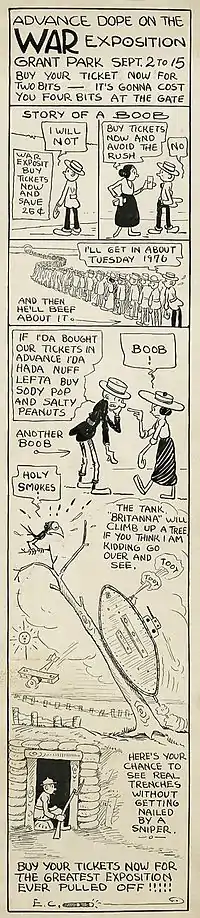Segar moved to Chicago, Illinois, where he met Richard F. Outcault, the creator of The Yellow Kid and Buster Brown. Outcault encouraged him and introduced him at the Chicago Herald.[2] On March 12, 1916, the Herald published Segar's first comic, Charlie Chaplin's Comic Capers, which ran for a little over a year. In 1917, Segar created Barry the Boob, about an incompetent soldier. Segar also originated two other, short-lived comics for the Herald's Sunday magazine. These were The Mistakes of Mr. Muddle and the Rube Goldberg-inspired And They Get By With It.[3] In 1918, he moved on to William Randolph Hearst's Chicago Evening American, for which he created Looping the Loop and worked as a second-string drama critic.[7][12] Looping the Loop was a comic strip that gave a whimsical take on the events in Chicago's "Loop" district. "Looping the Loop" made jokes about such issues as silent movies, plays, and the changing seasons; it proved popular with the Herald's readers.[7] Segar married Myrtle Johnson that year; they had two children. In October 1919, Segar covered that year's World Series, creating eight cartoons for the sports pages.[13][14]