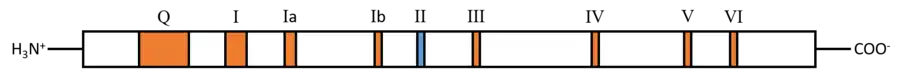 The general primary structure of eIF4A subfamily proteins. Conserved sequence motifs are represented by the colored segments with their names labeled above. Note that Motifs I and II are also known as the Walker Box A and Walker Box B motifs, respectively. Motif II, depicted in blue, is the location of the DEAD-box.[10][12]