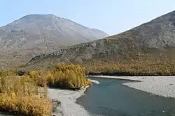 The Eastern Khandyga has its sources in the western section of the Suntar-Khayata Range.[4][5] The river heads roughly westwards and cuts across the Skalisty Range and the Sette Daban. After the river exits the mountain area it enters a wide floodplain, dividing into many channels and flowing roughly southwestwards. Finally if meets the right bank of the Aldan River a little downstream from the mouth of the Tyry, 467 km (290 mi) from the confluence of the Aldan with the Lena River.[6][4][7][5]
