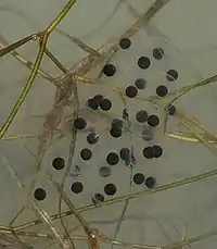 About 200-301 eggs are laid at each amplexus, and clumps of spawn contain up to 35 eggs. The minimum tadpole lifespan is 118 days, at a consist temperature of 20 °C. Metamorphosis occurs from January to March, the metamorphs resemble the adults and are very small, only 9–13 mm in length.
