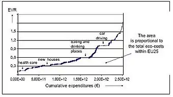 The eco-costs/value ratio (EVR) is an indicator to reveal sustainable and unsustainable consumption patterns of people. The eco-costs is an indicator for the environmental pollution of the products people buy, the value is the price they pay for it in our free market economy. Example: When somebody spends 1000 euro per month on housing (in Europe: EVR approx. 0,3) it is less harmful for the environment than when 1000 euro is spent on diesel (in Europe: EVR approx. 1,0). See section 3.1.
