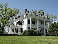 Ednam House is a historic home located near Ednam, Albemarle County, Virginia. It was designed by Richmond architect D. Wiley Anderson in Colonial Revival style. It was built about 1905, and is a two-story, wood-frame structure sheathed in weatherboards and set on a low, brick foundation. The main block is covered by a steep deck-on-hip roof, with tall, brick, pilastered chimneys with corbeled caps projecting from the roof on each elevation. Attached to the main block are a series of rear ells covered by low-hipped roofs. The front facade features an original colossal two-story portico consisting of four unfluted Ionic order columns.[3]