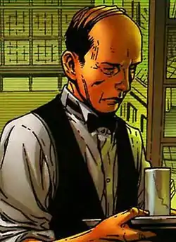 Later that year, the Secret Invasion storyline revealed that Edwin Jarvis has been replaced by a Skrull agent for some time.[13] Using a computer virus, he disables a number of Stark Enterprises facilities, as well as Iron Man's armor. This agent also obtained access to Tony Stark's records on the Sentry (Robert Reynolds) in order to discover weaknesses, as the Skrulls were unable to duplicate Sentry's powers because Sentry's limits were unknown even to Iron Man.[14] He later approaches Maria Hill on the destroyed S.H.I.E.L.D. Helicarrier in the middle of the ocean and tells Maria to surrender along with the S.H.I.E.L.D. crew. Maria uses a Life Model Decoy as a distraction while the real one escapes and detonates the S.H.I.E.L.D. Helicarrier. During the fight between Veranke and Criti Noll's forces against the heroes and villains, the Skrull-Jarvis (who somehow survived the S.H.I.E.L.D. Helicarrier explosion) watches from Avengers Tower as the energy washes over hero, villain and Skrull alike. While holding Jessica Jones and Luke Cage's child, he comments that it doesn't matter if the Skrulls win or lose, so long as "God's" will is done.[15] After the final battle, the real Jarvis is discovered alive, prompting Jessica to discover that her baby had been taken by the Skrull impostor.[16] During the Dark Reign storyline, Jarvis is later shown in a support group meeting with the others that had been replaced by Skrulls.[17] The Skrull impersonator is eventually found in a hideout and was shot by Bullseye after returning Luke's and Jessica's baby.[18] Having refused to serve under Norman Osborn's personal Avengers, Jarvis is sought out by Hercules and Amadeus Cho to be a part of the new Mighty Avengers team, Amadeus having determined that Jarvis is the one constant of the Avengers.[19]