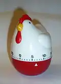 An egg timer or kitchen timer is a device whose primary function is to assist in timing during cooking; the name comes from the first timers initially being used for the timing of cooking eggs. Early designs simply counted down for a specific period of time. Some modern designs can time more accurately by depending on water temperature rather than an absolute time.