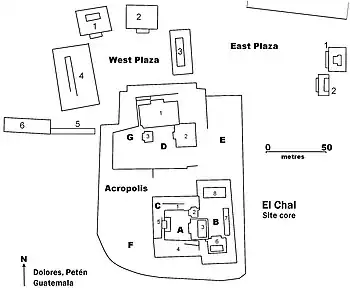 The site core of El Chal consists of an acropolis and three ceremonial plazas in which the majority of sculpted monuments were found, the East Plaza, West Plaza and Northeast Plaza.[7] There are also a number of other plazas in the site core.[7] The plazas and the majority of the residential structures were laid out upon naturally level terrain, while the acropolis was built upon a natural limestone hill and a very few residential groups were built upon artificial basal platforms.[7]