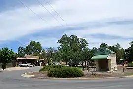 ![]() The main street of Eldorado. A Soldiers Memorial bus shelter is in the foreground while the General store and McEvoy Tavern ("The smallest pub in Victoria") can be seen to the left. | |