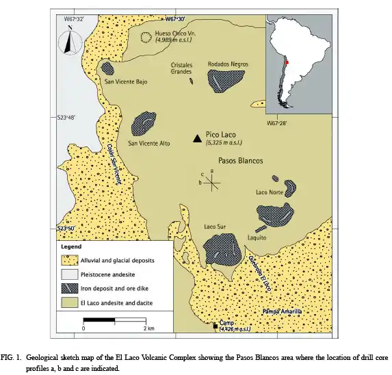 12. 1 2 3 4 5 6 Naranjo, José A.; Henríquez, Fernando; Nyström, Jan O. (January 2010). "Subvolcanic contact metasomatism at El Laco Volcanic Complex, Central Andes". Andean Geology. 37 (1): 110–120. doi:10.4067/s0718-71062010000100005. ISSN 0718-7106.
