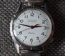 In horology, the term electric watch is used for the first generation electrically-powered wristwatches which were first publicly displayed by both Elgin National Watch Company and Lip on March 19, 1952, with working laboratory examples in Chicago and Paris. The Hamilton Watch Company would be the first to produce and retail an electric watch beginning in 1957,[1] before the commercial introduction of the quartz wristwatch in 1969 by Seiko with the Astron. Their timekeeping element was either a traditional balance wheel or a tuning fork, driven electromagnetically by a solenoid powered by a battery.[2] The hands were driven mechanically through a wheel train. They were superseded by quartz watches, which had greater accuracy and durability due to their lower parts count. Recent automatic quartz watches, which combine mechanical technology with quartz timekeeping, are not included in this classification.