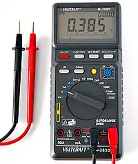 A multimeter with a built in clamp facility. Pushing the large button at the bottom opens the lower jaw of the clamp, allowing the clamp to be placed around a conductor (wire). Depending on sensor, some can measure both AC and DC current.