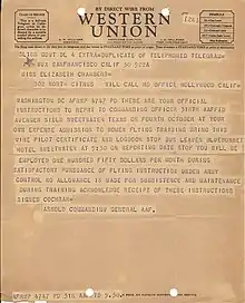 Telegram to Chambers from Jacqueline Cochran instructing her to report for duty