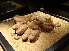 Several nests of Elongatoolithus eggs are known.[4][5][10] They follow the typical elongatoolithid pattern of arranging eggs in multi-layered circular nests.[2] The type specimen of E. andrewsi consists of a well preserved nest, containing eleven eggs arranged in at least two circular layers.[6][5] The type specimen of E. elongatus is a similarly structured, well preserved nest of 13 eggs. These eggs are broken, apparently because they had hatched before fossilizing.[13] Like other elongatoolithids, the eggs are found paired because the parents would lay two eggs at a time. Unlike modern birds, dinosaurs had two functioning oviducts, so they could produce two eggs simultaneously, as shown by a fossil oviraptorosaur discovered in China with a pair of elongatoolithid eggs preserved in its pelvis.[14]