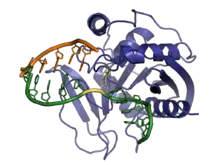 ![]() Crystallographic structure of Thermotoga maritima endoV (blue) in complex with DNA (green and orange). The deamidated base is shown in yellow.[1] | |||||||||