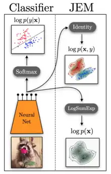 Joint energy-based models (JEM), proposed in 2020 by Grathwohl et al., allow any classifier with softmax output to be interpreted as energy-based model. Key observation is that such a classifier is trained to predict the conditional probability where is the y-th index of the logits corresponding to class y. Without any change to the logits it was proposed to reinterpret the logits to describe a joint probability density: