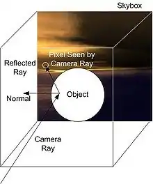 A diagram depicting an apparent reflection being provided by cube-mapped reflection. The map is actually projected onto the surface from the point of view of the observer. Highlights which in raytracing would be provided by tracing the ray and determining the angle made with the normal, can be "fudged", if they are manually painted into the texture field (or if they already appear there depending on how the texture map was obtained), from where they will be projected onto the mapped object along with the rest of the texture detail.