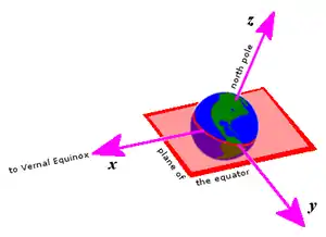 - A right-handed convention, specifying a y axis 90° to the east in the fundamental plane and a z axis along Earth's north polar axis.