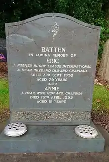 Eric Batten was the son of the rugby league footballer Billy Batten. Eric Batten's marriage to Annie (née Saxton, born c. 1914 in Wakefield district – died aged 81 on 13 April 1995) was registered during first 1⁄4 1937 in Wakefield district.[14] They had children; John Michael Batten (birth registered third 1⁄4 1940 in Hemsworth district) Janet Batten (birth registered first 1⁄4 1951 (age 72–73) in Hemsworth district), and Gaynor Batten (birth registered second 1⁄4 1953 (age 70–71) in Hemsworth district). He was buried at Lawnswood Cemetery, Leeds.