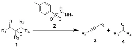 The Eschenmoser fragmentation, first published in 1967, is the chemical reaction of α,β-epoxyketones (1) with aryl sulfonylhydrazines (2) to give alkynes (3) and carbonyl compounds (4).[1][2][3] The reaction is named after the Swiss chemist Albert Eschenmoser, who devised it in collaboration with an industrial research group of Günther Ohloff, and applied it to the production of muscone and related macrocyclic musks.[1][2][4] The reaction is also sometimes known as the Eschenmoser–Ohloff fragmentation or the Eschenmoser–Tanabe fragmentation as Masato Tanabe independently published an article on the reaction the same year.[5][6] The general formula of the fragmentation using p-toluenesulfonylhydrazide is:[3]