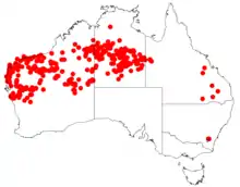The smooth-barked coolibah is found on flats and flood plains in the Mid West, Pilbara, Kimberley and north eastern Goldfields-Esperance regions of Western Australia where it grows in sandy-loamy or clay-sand soils.[5] It is also found through much of the Northern Territory and in far western Queensland.[9]