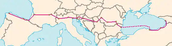 The E 70 routes through ten European countries, and includes one (not currently operational) sea-crossing, from Varna in Bulgaria to Samsun in Turkey.