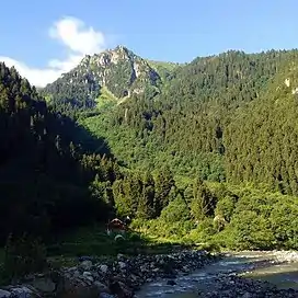 The Colchic or Colchian forests are found around the southeast corner of the Black Sea in Turkey and Georgia in and around the Machakhela National Park. The Colchian forests are mixed, with deciduous black alder (Alnus glutinosa), hornbeam (Carpinus betulus and C. orientalis), Oriental beech (Fagus orientalis), and sweet chestnut (Castanea sativa), together with evergreen Nordmann fir (Abies nordmanniana), Caucasian spruce (Picea orientalis) and Scots pine (Pinus sylvestris). The vegetation is diverse and varies with elevation.[3]