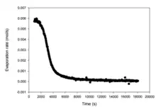 Evapoporometry has the significant advantage of requiring only a lab scale, 2-propanol (or another wetting fluid), and a cell in which to contain the sample and 2-propanol.[1][3] The sample is immersed for some time in 2-propanol prior to measurement to ensure saturation of pores, and is then placed into the cell in an analytical balance and immersed again in 2-propanol, after which the change in mass due to evaporation of the free-standing liquid layer and then draining of liquid from pores is measured by the analytical balance. Instantaneous evaporation rates are calculated from the mass data and input into the above equation to yield a pore-size distribution for the sample. can be used to quantitatively determine value of at which pore draining begins, which is equal to , where is the standard deviation of . This analysis is enabled by the principle that evaporation from small pores will only occur after 2-propanol in larger pores has completely evaporated.[1]