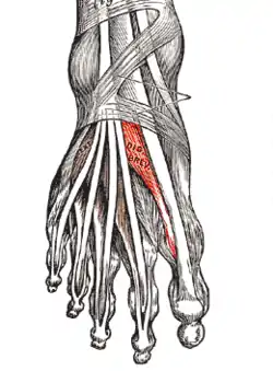 ![]() Muscles of the front of the leg. (Ext. hallucis brevis colored in red.) | |