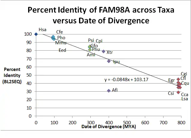 Genes homologous to FAM98A are predicted to occur in many taxa within Animalia, but there are other taxa outside of Animalia that may have homologous FAM98 genes in their genomes. Eukaryotes such as the opisthokonts Monosiga brevicollis (XP_00174505.1) and Capraspora owczarzaki (XP_004346371.1), and even the protist Chlorella variabilis (XP_005845167.1), a green alga, may contain FAM98 in their genomes.[20]