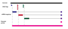 - ↑ de Hoon, Michiel; Hayashizaki, Yoshihide (April 2008). "Deep cap analysis gene expression (CAGE): genome-wide identification of promoters, quantification of their expression, and network inference". BioTechniques. 44 Supplement (4): 627–632. doi:10.2144/000112802. PMID 18474037.