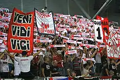 One of the first organized supports of Vojvodina fans was recorded in 1931, at the away game against Mačva Šabac. Already in 1937, the first organized supporters club was established, probably the first organized supporter group in the former Yugoslavia.[24] Although the club had numerous supporters throughout the history, more organized groups emerged end of the 1970s and beginning of the 1980s. In 1989, for the first time starts the idea of uniting of all the smaller supporter groups. This idea is realized and the group was named Red Firm. A few days later, several youngsters established the group Firma (English: The Firm) as one of the subgroups, because they wanted a Serbian name for their group. The disintegration of Yugoslavia and its follows led to stagnation in all Yugoslavian supporter groups so that in 1992, the Red Firm fell apart and the Firma took over the leadership of the organized supports. The members of Firma call themselves Firmaši (English:Members of the Firma), the plural of the singular form Firmaš, and belongs today to the top supporter groups in Serbia.[25] They are more known as ultras, not hooligans. However, they always protected the name and honour of FK Vojvodina, Novi Sad and Serbia, putting themselves against all who were not doing enough for the club.[26] The Firmaši gather in the north stand of the Karađorđe Stadium, from where they fiercely support their club. Besides football, they also support other sport sections of the Vojvodina Novi Sad Sport Association. The club also has a group of their oldest supporters, called the Stara Garda (English: Old Guard) and who are for more than 40 years in the east stand of the stadium.[27]