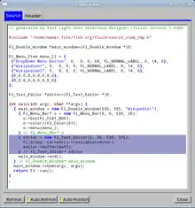 FLUID (Fast Light User Interface Designer) is a graphical editor and GUI builder that is used to produce FLTK source code. FLUID edits and saves its state in text .fl files, which can be edited in a text editor for finer control over display and behavior.[1]