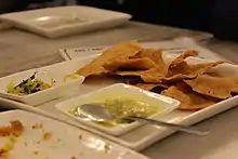 To create Fafda, besan (Gram flour), oil, carom seeds (ajwain), papad khar and salt are mixed in a bowl. A dough is made from the mixture using enough water. Small balls of the dough are rolled into a cylindrical shape, and after flattening, deep-fried till they turn crispy. On festival days, the shops that make fafda can have lines that start at 4 am. [3] It is served with a chutney and salty fried-green chilis. Fafda is also accompanied with spicy shredded vegetables colloquially called "sambharo". The vegetables in the sambharo can be carrots or shredded spicy papaya. [4]