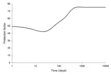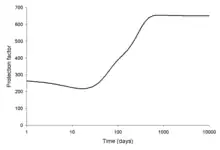 ![]() The protection factor provided by 30 cm of concrete shielding where the source is the idealised Chernobyl fallout.[40] |
