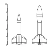 The Falstaff with the Stonechat Mk 2 booster was 5.3 m (17 ft) long and had a diameter of 92 cm (36 in). It weighed 5.09 tonnes (5.01 long tons; 5.61 short tons) of which 4.34 tonnes (4.27 long tons; 4.78 short tons) was solid propellant.[3] It delivered an average thrust of 240 kilonewtons (54,000 lbf) during 37 seconds.[3]