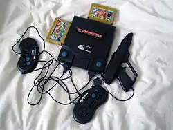 The Power Player Super Joy III consoles (also known as Power Games and XA-76-1E) are a line of unauthorized handheld Nintendo Entertainment System/Famicom clones manufactured by NRTRADE that are sold in North America, Brazil, Europe, Asia, and Australia. The system resembles a Nintendo 64 controller and attaches to a TV set. The second controller resembles a Sega Genesis controller, and a light gun is also included. NTSC, PAL and SECAM versions are available. They all use a custom "NES-on-a-chip" (NOAC) that is an implementation of the NES's hardware (Custom 6502, PPU, PAPU, etc.). The consoles came with 76 built-in games, although marketing frequently claims to have 1,000+ ways of playing them. Most of the included games were originally released for the NES or Famicom, but some have been created by the manufacturer to expand their list of included games. Most of the games have had their title screen graphics removed to save space on the ROM chip, not to mention a company logo removal trick for reduced liability. After this product gained some popularity, the Power Player 3.5, an improved model with more games, was released. A wireless version of Power Games was also released.[7][8][9]