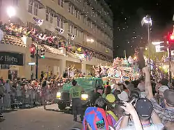 Fantasy Fest has been compared to New Orleans Mardi Gras and Carnival in Rio de Janeiro.[1] As with New Orleans Mardi Gras on Bourbon Street in New Orleans, Fantasy Fest tend to attract many people to the concentration of bars along Duval Street. Most of the event is adult oriented, however, there are family friendly events.[7] Nudity is illegal in Key West, but on the last two days of Fantasy Fest the city designates a "Fantasy Zone" in the city where women may expose their breasts if they are covered with body paint.[8] Costumes worn at Fantasy Fest often feature nudity and sexual symbolism.[1]