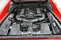 Apart from the displacement increase from 3.4 L (3,405 cc) to 3.5 L (3,495 cc), the major difference between the V8 engine in the 348 and F355 is the introduction of a 5-valve cylinder head. This new head design allowed for better intake permeability and resulted in an engine that was considerably more powerful, generating a maximum power output 380 PS (279 kW; 375 hp) at 8,250 rpm and 363 N⋅m (268 lb⋅ft) of at 6,000 rpm.[3] The longitudinally mounted 90° V8 engine was stroked by 2 mm over the 348's engine (77 mm rather than 75 mm), resulting in the small increase in displacement. Engine internals are produced using lightweight materials; the connecting rods are forged in Ti6-Al-4V titanium alloy. The engine's compression ratio is 11:1 and employs the Bosch Motronic 2.7 engine control unit in the 1995 model year, later changed to the M5.2 in 1996 through end of production. The Motronic system controls the electronic fuel injection and ignition systems, with a single spark plug per cylinder. Engine lubrication is via a dry sump oiling system. The engine was designed by Paolo Martinelli.[4]