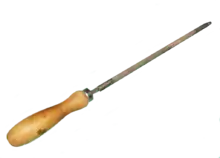A file is a tool used to remove fine amounts of material from a workpiece. It is common in woodworking, metalworking, and other similar trade and hobby tasks. Most are hand tools, made of a case hardened steel bar of rectangular, square, triangular, or round cross-section, with one or more surfaces cut with sharp, generally parallel teeth. A narrow, pointed tang is common at one end, to which a handle may be fitted.[1]