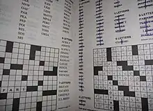 Fill-Ins, also known as Fill-It-Ins or Word Fill-Ins, are a variation of the common crossword puzzle in which words, rather than clues, are given, and the solver must work out where to place them.[1][2][3][4] Fill-Ins are common in puzzle magazines along with word searches, cryptograms, and other logic puzzles.[5] Some people consider Fill-Ins to be an easier version of the crossword.[6] Since the Fill-In requires no outside knowledge of specific subjects,[7] one can solve the puzzle in another language.[3]