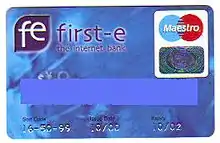 First-e was a European online bank during the Dot-com bubble of 1999–2001. The company was based in Dublin, Ireland and employed 280 people, with 250,000 customers.[1] It operated on a licence from French bank Banque d'Escompte,[1] an innovation that allowed it to get around the usual difficulties faced by European banking startups.[2] It launched with €200m in funding from various institutions including Intel, Morgan Stanley and Apax Partners[3] and initially targeted the British market with a savings interest rate 2% higher than its high-street competitors, and gained 250,000 customers.[4]
