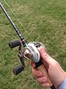 Most fishing reels are suspended from the bottom side of the rod, since this position doesn't require wrist strength to overcome gravity while enabling the angler to cast and retrieve without changing hands.[16] The baitcasting reel's unusual mounting position atop the rod is an accident of history.[16] Baitcasting reels were originally designed to be cast when positioned atop the rod, then rotated upside-down in order to operate the crank handle while playing a fish or retrieving line.[16] However, in practice most anglers preferred to keep the reel atop the rod for both cast and retrieve by simply transferring the rod to the left hand for the retrieve, then reverse-winding the crank handle.[16] Because of this preference, mounting the crank handle on the right side of a bait casting reel (with standard clockwise crank handle rotation) has become customary, though models with left-hand retrieve have gained in popularity in recent years thanks to user familiarity with the spinning reel.[18]