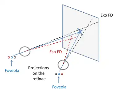 Fixation disparity is a tendency of the eyes to drift in the direction of the heterophoria. While the heterophoria refers to a fusion-free vergence state, the fixation disparity refers to a small misalignment of the visual axes when both eyes are open in an observer with normal fusion and binocular vision.[1] The misalignment may be vertical, horizontal or both. The misalignment (a few minutes of arc) is much smaller than that of strabismus. While strabismus prevents binocular vision, fixation disparity keeps binocular vision, however it may reduce a patient's level of stereopsis. A patient may or may not have fixation disparity and a patient may have a different fixation disparity at distance than near. Observers with a fixation disparity are more likely to report eye strain in demanding visual tasks; therefore, tests of fixation disparity belong to the diagnostic tools used by eye care professionals:[2][3][4][5][6] remediation includes vision therapy, prism eye glasses, or visual ergonomics at the workplace.