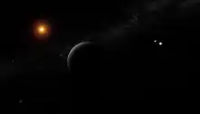 The flare star Wolf 359 is another near neighbor (2.39 ± 0.01 parsecs). This star, also known as Gliese 406 and CN Leo, is a red dwarf of spectral class M6.5 that emits X-rays.[8] It is a UV Ceti flare star,[9] and has a relatively high flare rate.