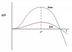 critical nucleus radius, at some intermediate value of , the free energy goes through a maximum, and so the probability of formation of a nucleus goes through a minimum. There is a least-probable nucleus occurs, i.e., the one with the highest value of where