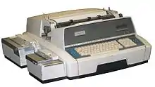 The 2300 series were cosmetically similar to the 2200 series, although without the function keys or numeric keypad, with a simplified plugboard, and operating at 145 words per minute (12 characters per second).[14] In addition to the basic 2301, the 2302 supported the auxiliary tape readers and punches from the 2200 family. The 2304 offered proportional spacing and a carbon ribbon mechanism, making it suitable for preparing camera-ready copy.[15] The base price for the 2300 family was £1400 (British pounds).[16] This would be the last hurrah for the line, with production halting in the early 1970s.
