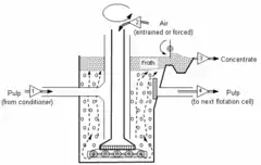 Mechanical cells use a large mixer and diffuser mechanism at the bottom of the mixing tank to introduce air and provide mixing action. Flotation columns use air spargers to introduce air at the bottom of a tall column while introducing slurry above. The countercurrent motion of the slurry flowing down and the air flowing up provides mixing action. Mechanical cells generally have a higher throughput rate, but produce material that is of lower quality, while flotation columns generally have a low throughput rate but produce higher quality material.