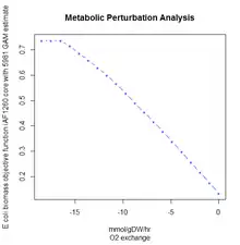 Reaction inhibition: Plot of FBA predicted growth rate (y-axis) to decreasing influx of Oxygen (x-axis) in an E.coli FBA model.