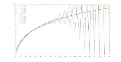 Evolution of the sequence for several values of , around the Foias constant . Evolution for is in green. Other initial values lead to two accumulation points, 1 and . A logarithmic scale is used.