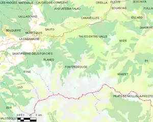 Fontpédrouse is located in the canton of Les Pyrénées catalanes and in the arrondissement of Prades. Fontpédrouse-Saint-Thomas-les-Bains station has rail connections to Villefranche-de-Conflent and Latour-de-Carol.