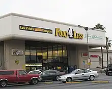 Food 4 Less is the name of several grocery store chains, the largest of which is currently owned by Kroger.[4] It is a no-frills grocery store where the customers bag their own groceries at the checkout. Kroger operates Food 4 Less stores in the Chicago metropolitan area (Illinois and Indiana) and in Southern California. Kroger operates their stores as Foods Co. in northern and central California, including Bakersfield and the Central Coast, because they do not have the rights to the Food 4 Less name in those areas. Other states, such as Nevada, formerly contained Kroger-owned Food 4 Less stores.[5]